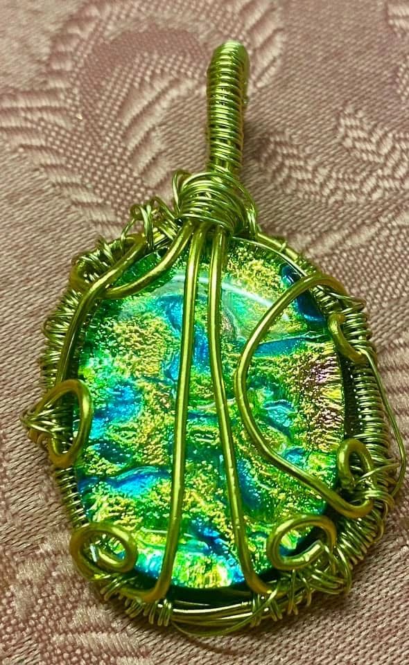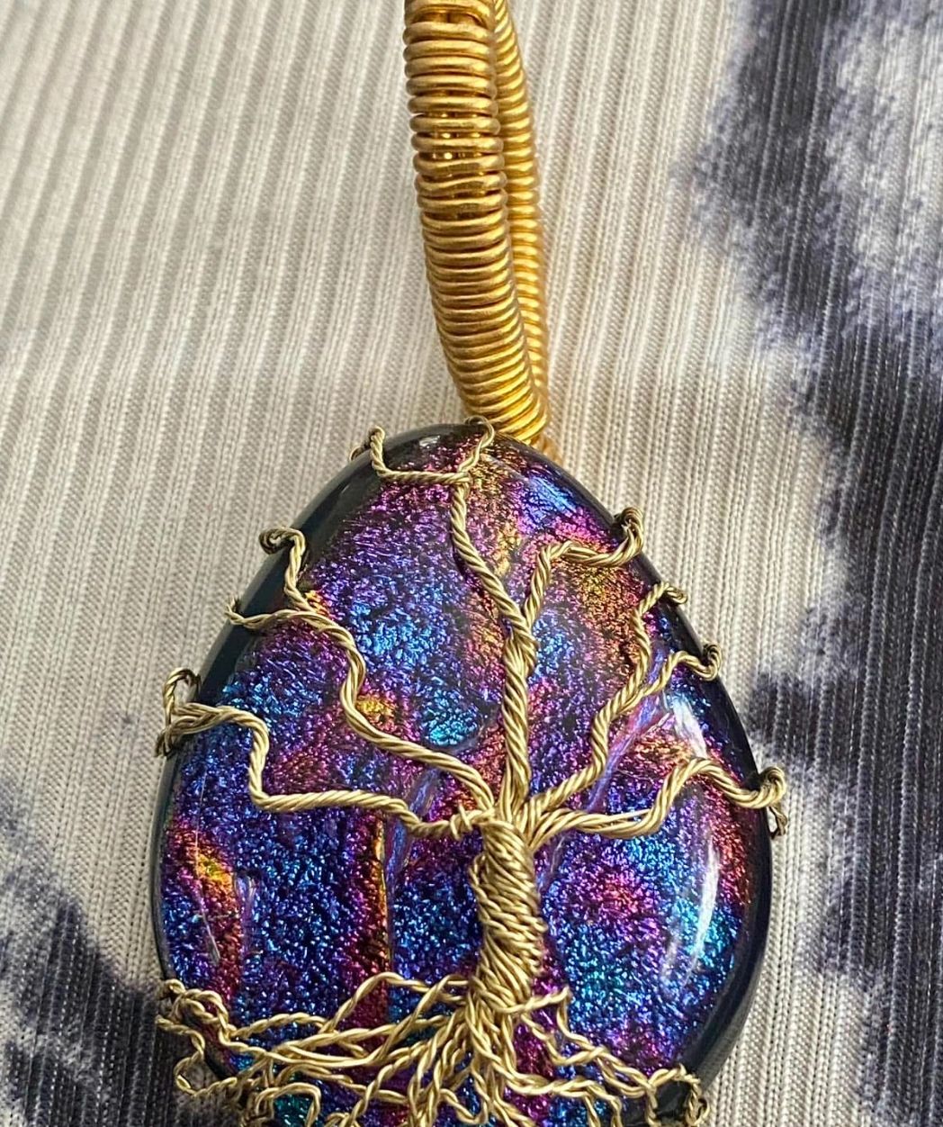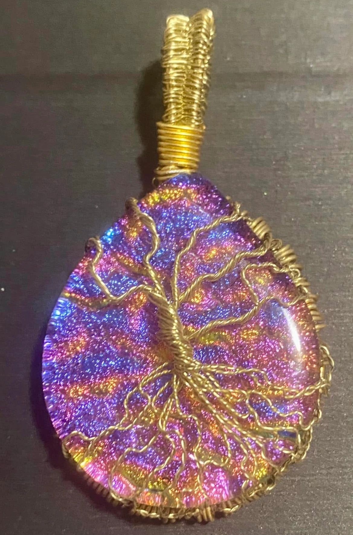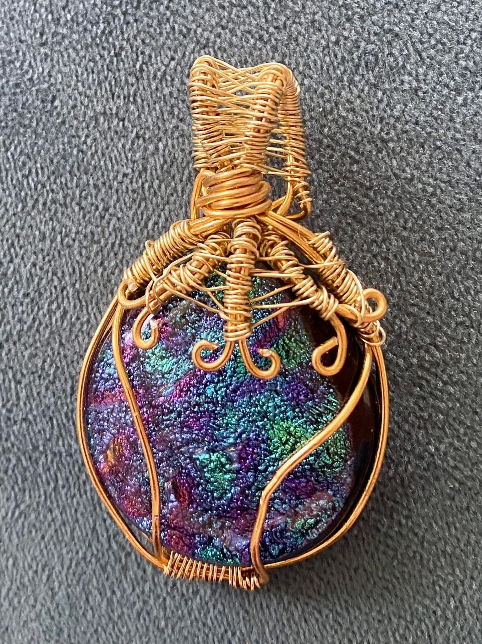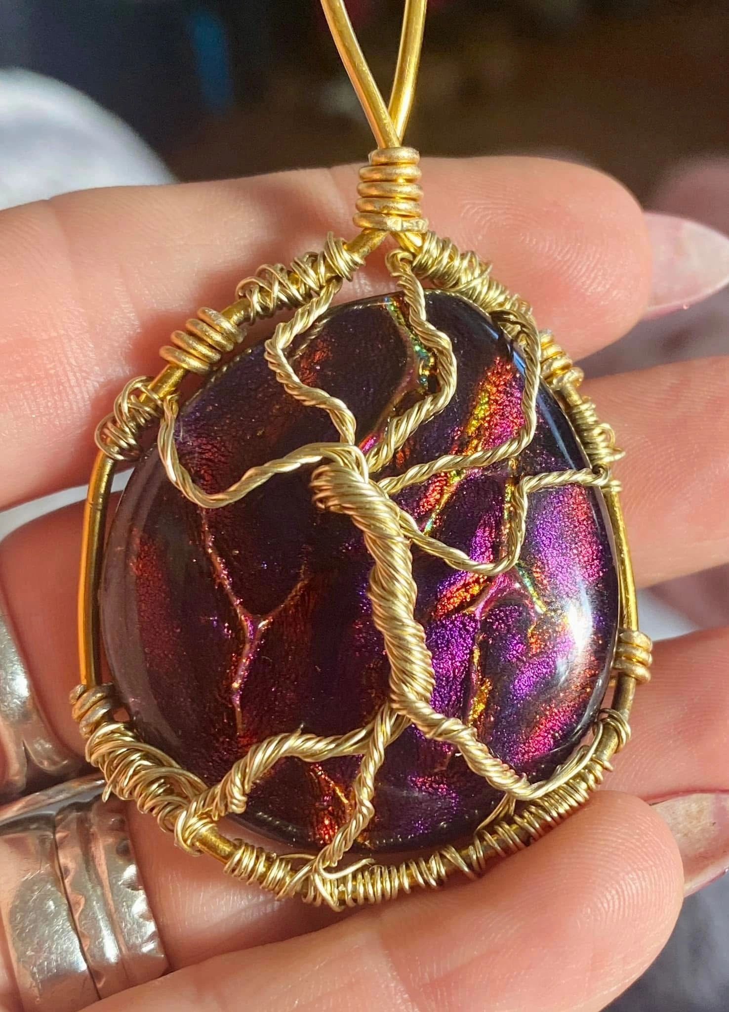 Some pendants that I make & sell in my tattoo shop. Every one is unique as no two dichroic glass cabochon’s come out the same from my kiln.